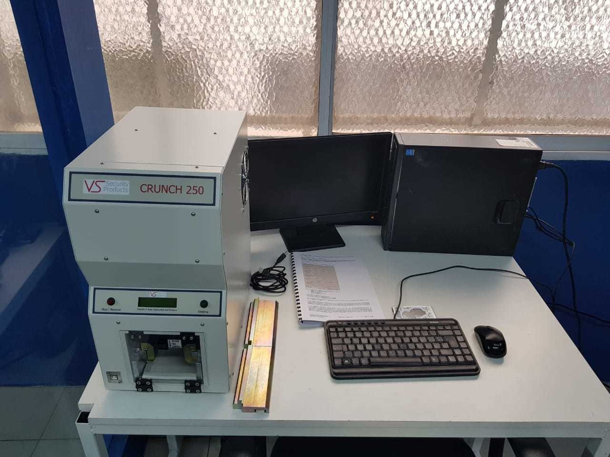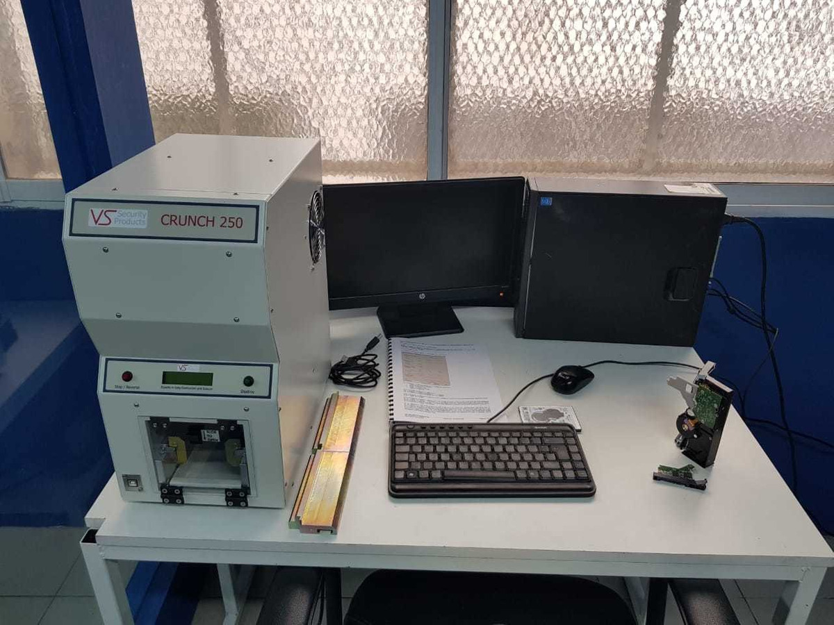 Nuestra Empresa cuenta con Equipamiento de Ultima Generación que Cumple con los Requerimientos y Certificados de la Agencia Nacional de Seguridad De los Estados Unidos. Somos la única compañía del Pais en Contar con Dicho Equipamiento y Certificaciones. Realizamos Servicios Onsite, y en Nuestro Laboratorio. Nuestro DEGAUSSER Es el mas potente en la actualidad, ya que Crea un Campo Magnetico de 22.000 gauss Asegurando así la eliminación Total de la información en menos de 1 minuto. También se puede complementar el proceso con la destrucción física del disco, mediante el Equipo Crunch.